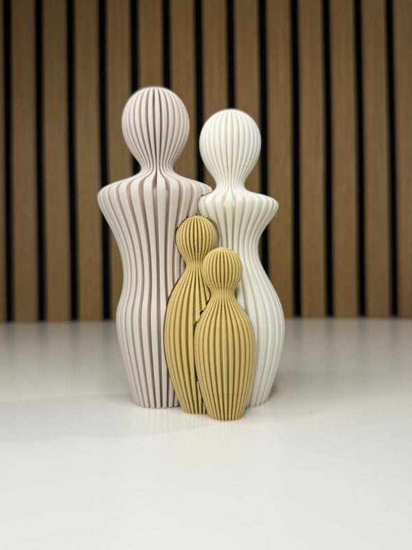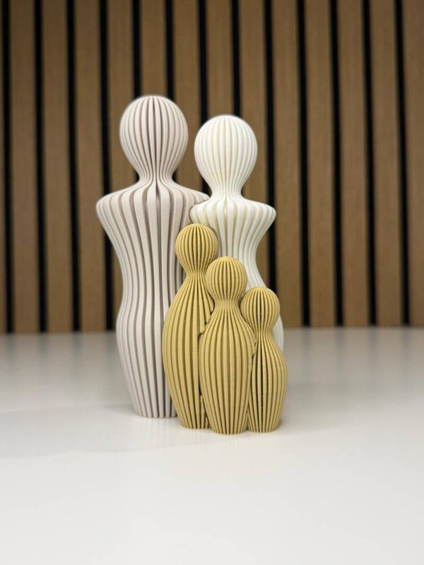 Deze moderne familiebeeldjes combineren zachte, organische vormen met strakke 3D-printtechniek. Het vloeiende lijnenspel en de verfijnde ribstructuur geven elk beeld een warme, stijlvolle uitstraling die rust brengt in iedere ruimte.